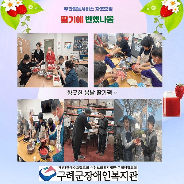 주간활동서비스 에서는 자조활동(요리)으로 제철 딸기를 활용한 달콤한 딸기쨈 만들기를 하였습니다! 딸기 꼭지를 하나하나 정성껏 따고, 설탕과 버무리고 손으로 직접 으깨며 딸기 특유의 달콤한 향이 퍼져나가자, “벌써 맛있을 것 같아요!”라고 말하며 쨈이 졸여지며 퍼지는 딸기 향기에 모두가 기분이 좋아졌고, 완성된 딸기쨈은 한 병씩 집에 가져가 가족들과 함께 나누고, 복지관 선생님들과 목공교실, 도예교실 협력기관 선생님들께도 전해드리기 위해 정성껏 병에 담았습니다. 이번 활동을 통해 협동의 즐거움, 나눔의 기쁨, 성취의 뿌듯함을 모두 느낄 수 있었던 시간으로 무엇보다 “내가 만든 쨈을 소중한 사람들과 나누고 싶다”는 따뜻한 마음이 가득한 시간이었습니다.