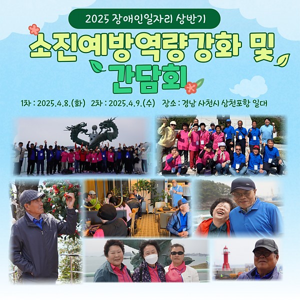 직업지원팀에서는 2025년 장애인일자리 복지형일자리 참여형 참여자 50명을 대상으로 2025.3.25.(화)부터 28.(금)까지 4일간 진행된 참여자 욕구조사를 통해 선정된 경남 사천시 삼천포항 일대에서 장애인일자리 참여자의 외부 활동 기회를 확대하고 근무에 대한 고충을 나누며 근무의욕을 고취시키고자 「소진예방역량강화 및 간담회」를 4.8.(화), 4.9.(수) 양일간 개최했습니다.