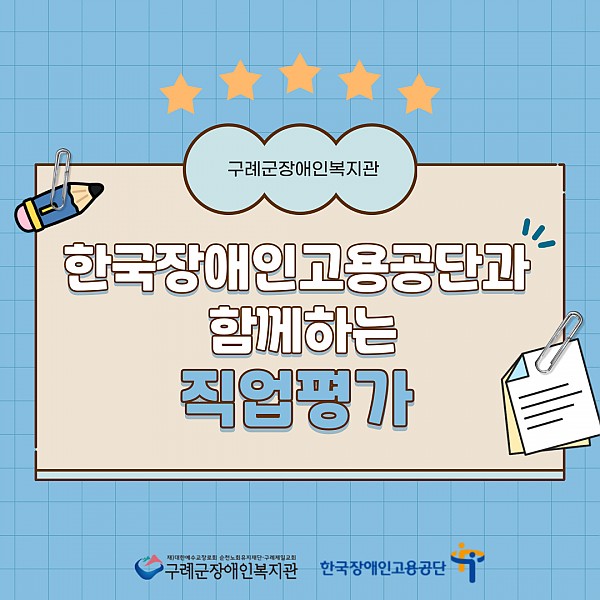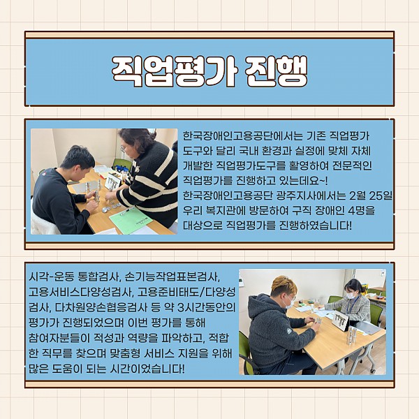 구례군장애인복지관에서는 장애인분들의 적성과 역량을 파악하고, 보다 나은 취업 기회를 제공하기 위해 직업평가를 진행하였습니다! 이번 직업평가는 기존의 직업평가도구와 달리, 한국장애인고용공단에서 우리나라 환경에 맞게 자체 개발한 평가 도구를 활용해 진행되었는데요~