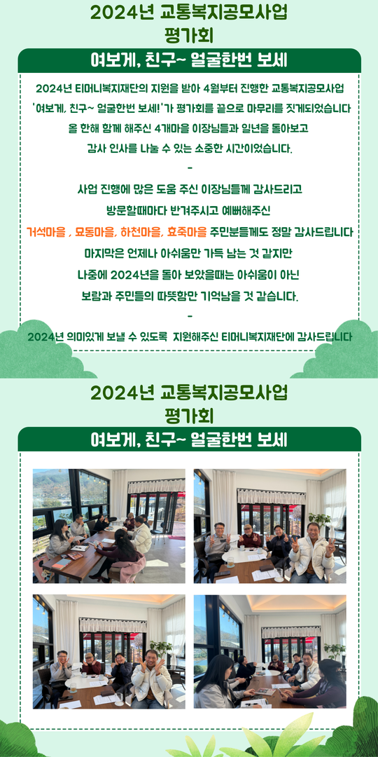 평가회는 일년동안 함께해주신 거석마을, 묘동마을, 하천마을, 효죽마을 이장님들과 2024년을 돌아보고 감사인사를 나눌 수 있는 소중한 기회가 되었습니다. 지원해주신 티머니복지재단에 감사드리고 사업 진행에 물심양면으로 도움주신 이장님들과 거석마을, 묘동마을, 하천마을, 효죽마을 주민분들께 감사드립니다.