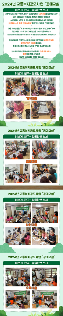 지역연계팀에서는 2024년 티머니복지재단의 지원을 받아 원거리 교통소외지역 주민들의 복지서비스 향상 및 공동체 의식 확산을 위한 농촌산간형 프로그램 '여보게, 친구~ 얼굴한번보세'를 진행하고 있으며 다음과 같이 공예교실을 진행하였습니다