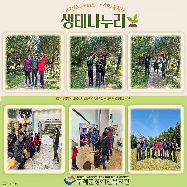 사회서비스센터 주간활동서비스팀은 11월 사회적응활동으로 ‘생태나누리’라는 주제로 지리산국립공원과 연계한 탄소 중립 체험 및 구례지역 명소 탐방 프로그램을 진행하였습니다.