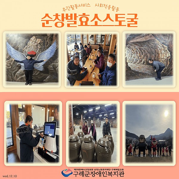 사회서비스센터 주간활동서비스팀은 2025년 마지막 사회적응활동으로 순창을 다녀왔습니다. 순창은 고추장의 고장으로 잘 알려져 있으며, 발효테마파크와 발효소스토굴 등 다양한 체험 콘텐츠가 있는 곳입니다. 이번 활동은 그중에서도 발효소스토굴 탐방을 중심으로 진행되었습니다.
