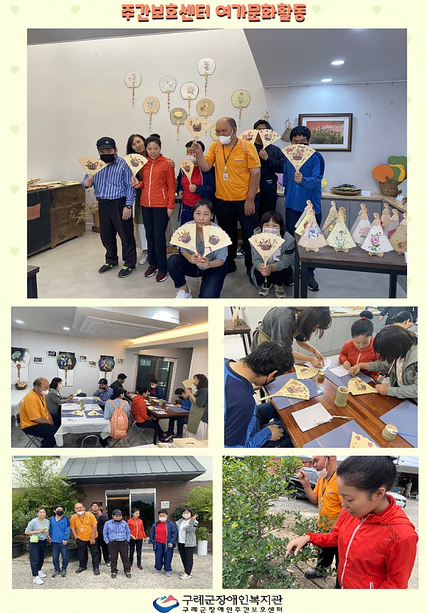 주간보호센터에서는 6월 5일(월요일)여가활동으로 사라져가는 우리 전통 부채의 명맥을 잊고 있는 '죽호바람'부채공방에서 압화 부채 만들기를 실시하였습니다.