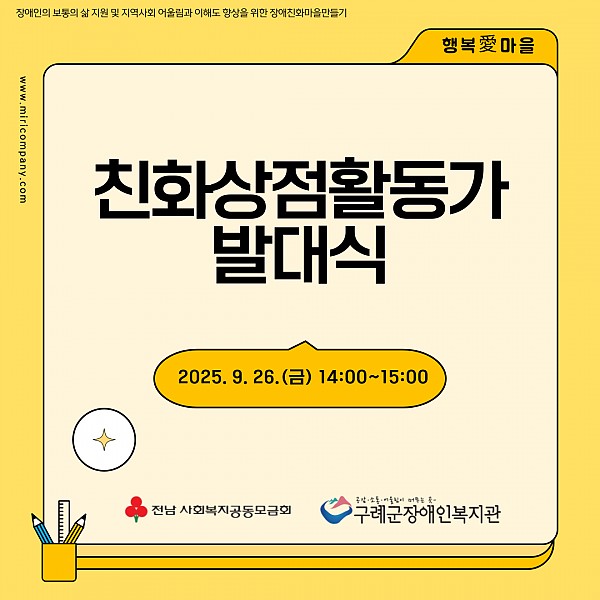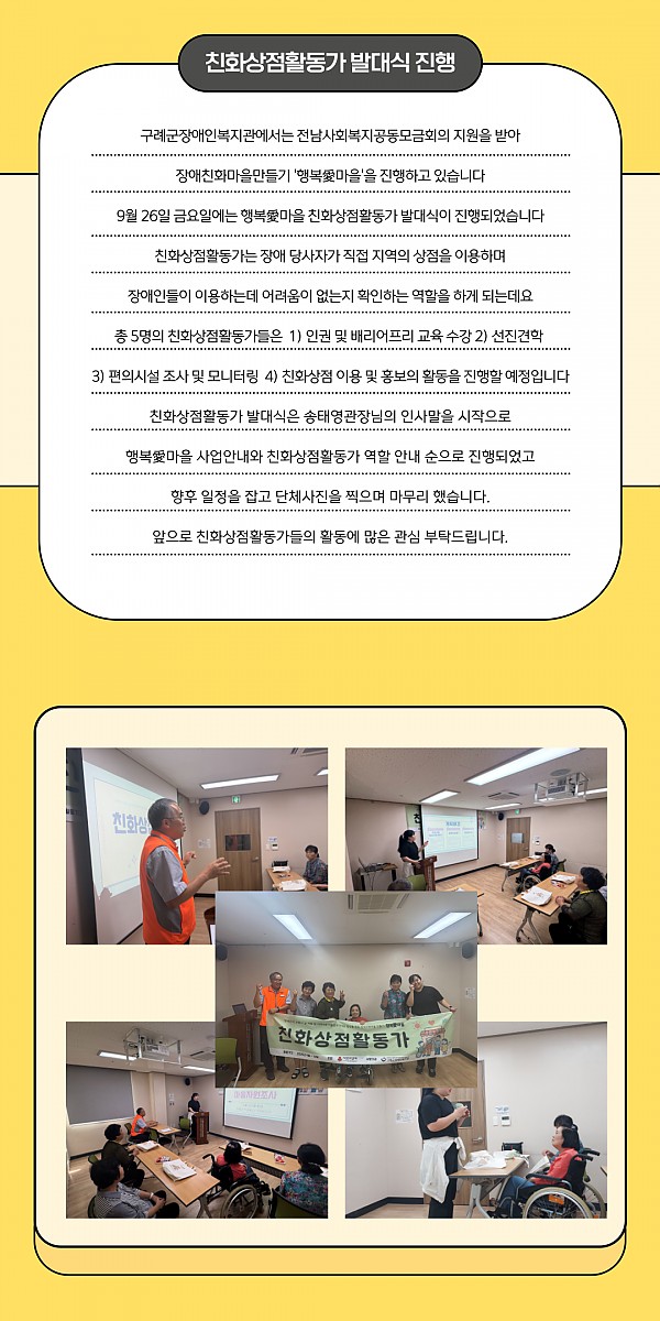 구례군장애인복지관에서는 전남사회복지공동모금회 지원을 받아 진행하고 있는 장애친화마을만들기 '행복愛마을'의 일환으로 친화상점활동가 발대식을 진행했습니다.