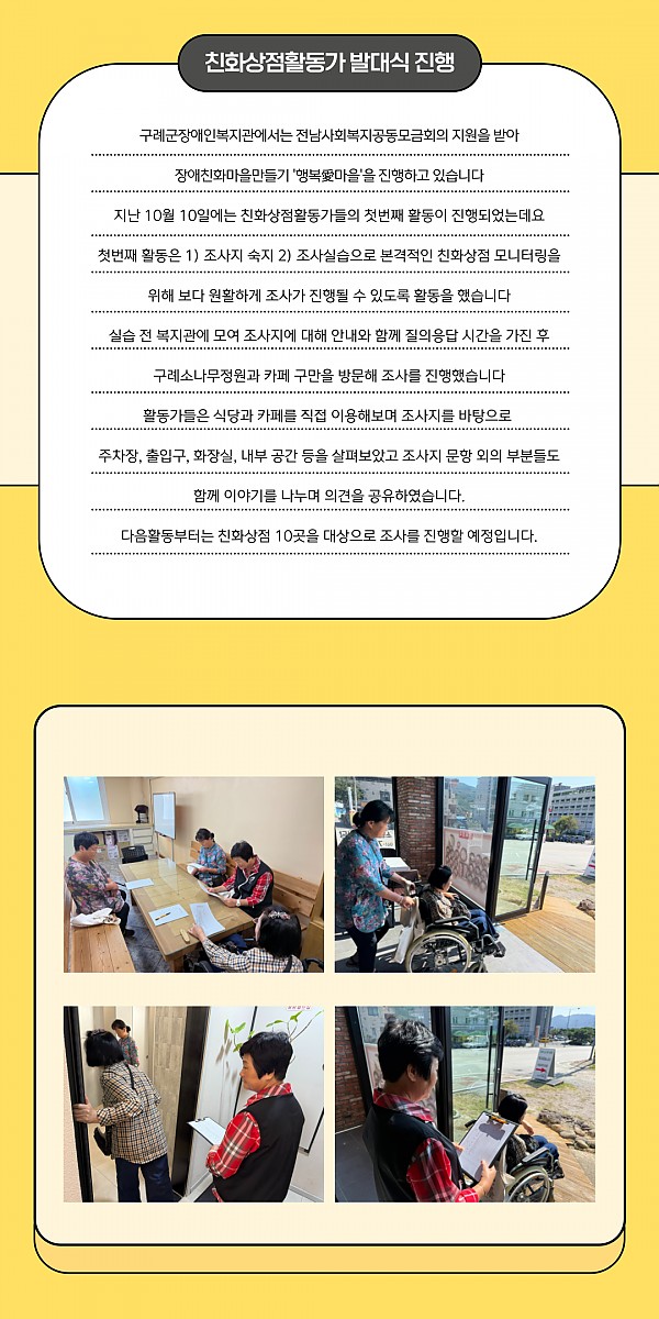 지난 10월 10일 친화상점활동가들의 1차 활동이 진행되었습니다. 친화상점활동가들은 본격적인 조사 전 조사지 숙지 및 조사 실습을 진행하였으며 이후 친화상점 10곳에 대한 조사를 진행할 예정입니다.