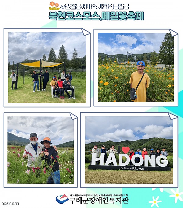 사회서비스센터 주간활동서비스팀은 사회적응활동으로 하동에서 열리는 북천코스모스,메밀꽃 축제장을 방문하였습니다.