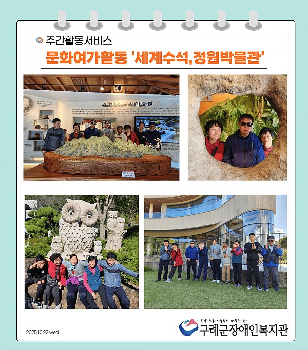 사회서비스센터 주간활동서비스팀은 문화여가활동으로 순천에 위치한 세계수석,정원박물관을 방문하였습니다.