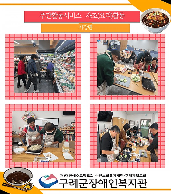 주간활동서비스에서는 자조모임을 통해 나온 이용자분들의 의견을 반영해 직접 장보기부터 재료 손질, 조리까지 정성을 가득 담아 자장면 만들기 활동을 진행하였습니다.