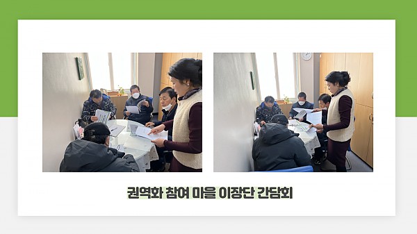 간담회에는 하천, 거석, 묘동, 중한치마을 이장님이 참여해주셨으며, 올해의 사업 계획을 설명을 시작으로 작년 사업 진행 시 만족했던 점, 아쉬웠던 점에 대해 얘기를 하며 사업 진행 방향에 대하여 회의를 하는 시간을 가졌습니다.
