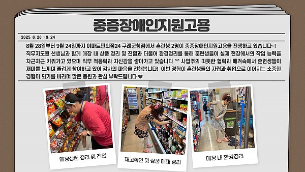 직업지원팀에서는 8월 28일부터 9월 24일까지 이마트편의점24 구례군청점에서 훈련생 2명이 중증장애인지원고용을 진행하고 있습니다~!
