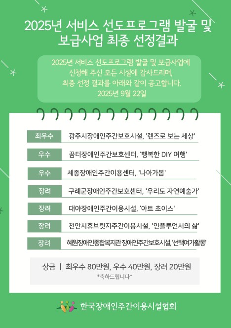 주간보호센터에서는 한국장애인주간이용시설협회 주관 <2025년 서비스 선도프로그램 발굴 및 보급사업>에서 "우리도 자연예술가" 프로그램이 최종 장려상으로 선정되었습니다.