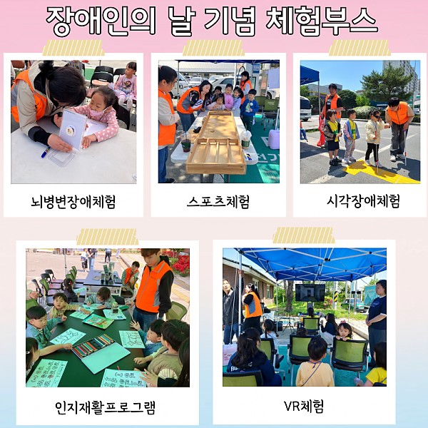 이어 진행된 4월 25일(금) 장애인의 날 체육행사 체험부스에는 지역 어린이집과 유치원(5~7세) 미취학 아동 130명 이상이 참여하여, 다양한 체험 활동을 통해 장애인에 대한 공감을 키우는 시간을 가졌습니다.  아이들은 뇌병변, 시각장애, 인지프로그램, VR체험, 장애인 체육체험(보치아, 한궁, 슐런) 등 다양한 체험을 즐기며 자연스럽게 장애 인식 개선에 동참하였습니다.