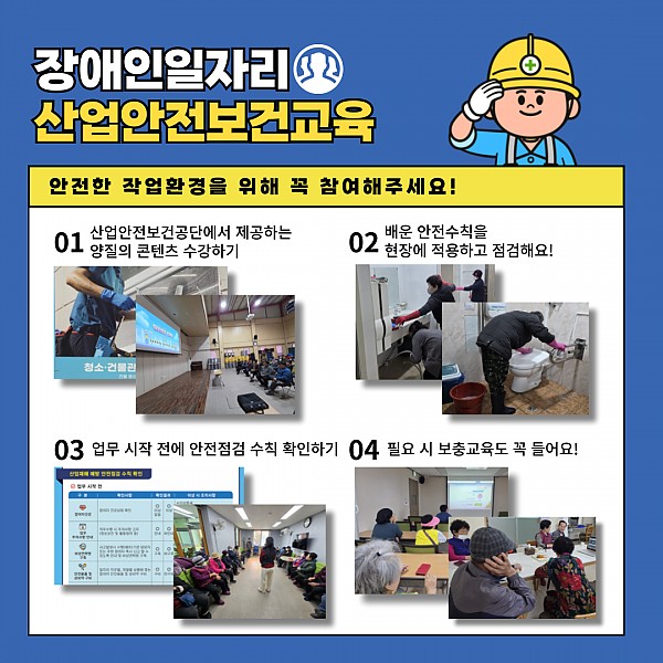 장애인일자리 사업이 안전하게 진행될 수 있도록 참여자들과 관계자 여러분의 많은 관심이 필요합니다. 안전한 작업환경을 위해 산업안전보건교육에 꼭 참여해주세요! 감사합니다!