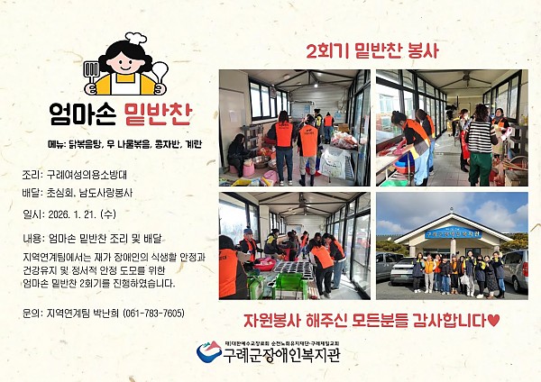 지역연계팀에서는 지난 1월 21일(수) 지역 내 재가 장애인 식생활 안정과 건강유지 및 정서적 안정도모를 위한 엄마손 밑반찬 2회기를 진행하였습니다. 엄마손 밑반찬조리 및 배달은 지역자원봉사단체에서 수고를 해주셨습니다.
