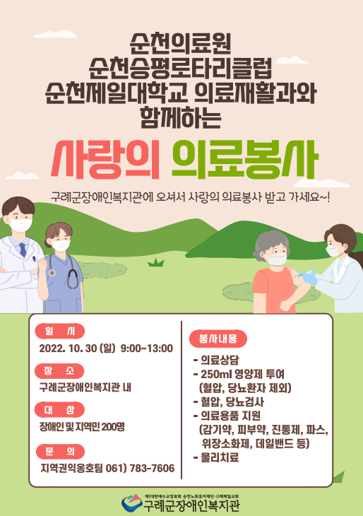 구례군장애인복지관은 순천의료원, 순천승평로타리클럽, 순천제일대학교 의료재화활과와 함께 <사랑의 의료봉사>를 진행하고자 합니다. 많은 관심과 참여 부탁드립니다!