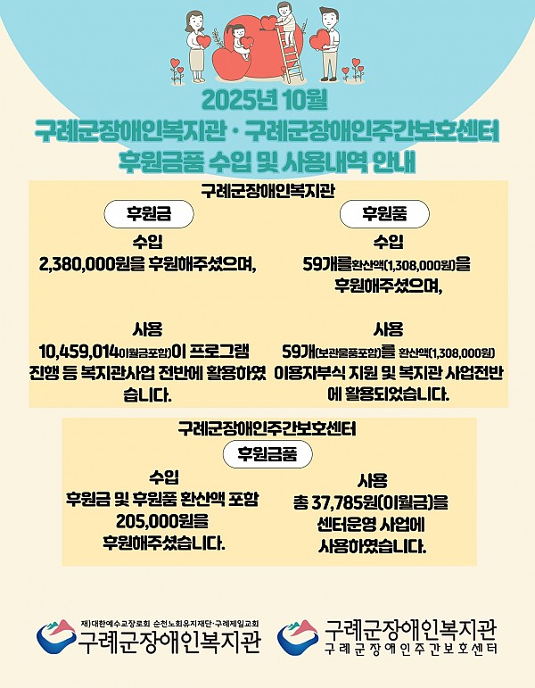 [공지사항] 구례군장애인복지관·구례군장애인주간보호센터 2025년 10월 후원금품 수입 및 사용내역을 안내합니다.