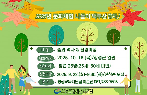 구례군장애인복지관 평생교육지원팀에서는 2025년 문화체험나들이 '백두산'(2차) 참여자를 모집합니다.