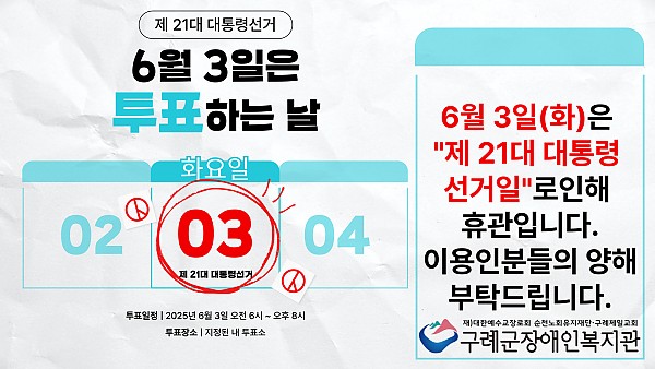 2025년 6월 3일(화) 복지관이 제21대 대통령 선거일로 인해 휴관합니다.