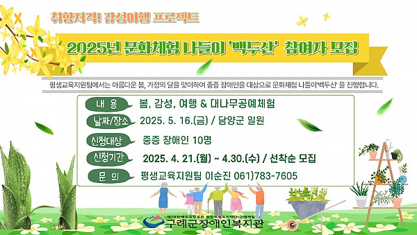 구례군장애인복지관 평생교육지원팀에서는 2025년 문화체험 나들이 '백두산' 참여자를 모집합니다.