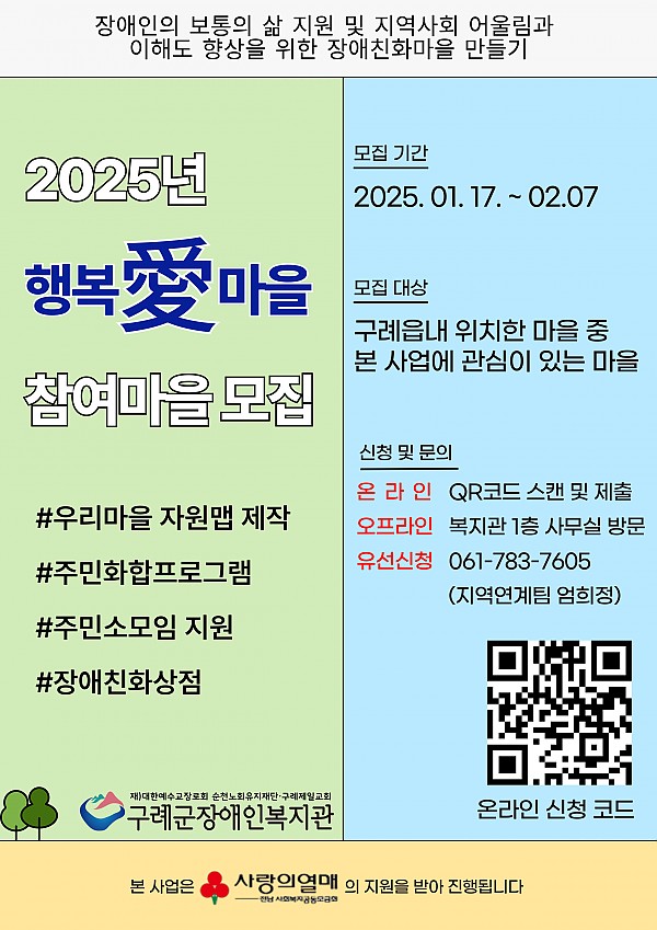 이와 관련하여 2025년 구례군장애인복지관과 동행할 참여 마을을 모집하고자 하며 함께하는 마을에게는