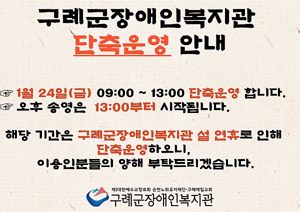 [공지사항} 1월 24일 금요일, 복지관 단축운영 안내