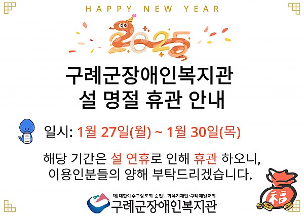 2024년 1월 27일(월) ~ 30일(목) 복지관이 설 명절로 인해 휴관합니다.