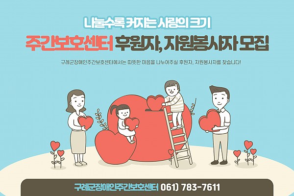 구례군장애인주간보호센터에서는 후원자, 자원봉사자를 연중상시 찾고있습니다.